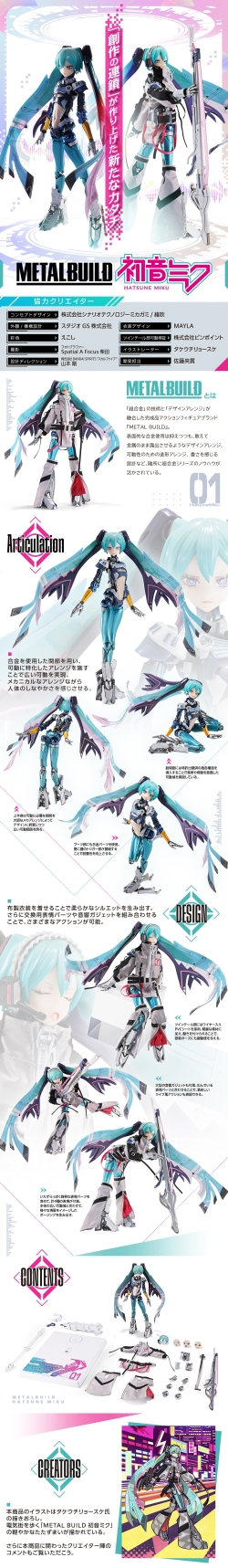 The virtual singer Hatsune Miku joins METAL BUILD! Utilizing the alloy joint structure technology cultivated over the years, this figure pursues the charm of the character and the appeal of an action figure through the use of composite materials!
