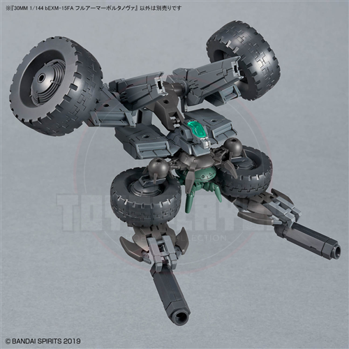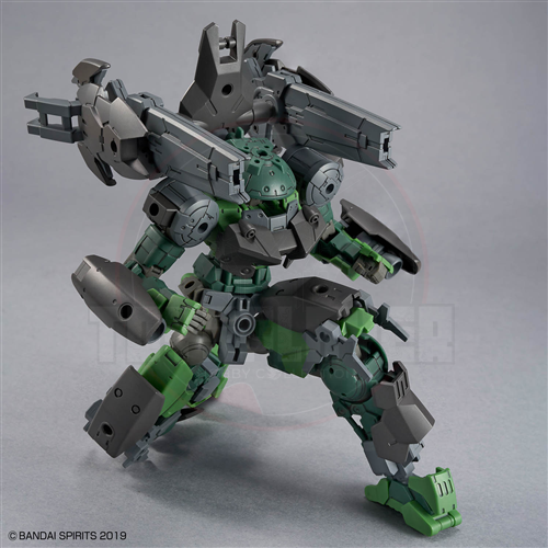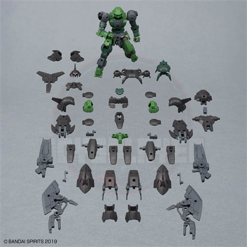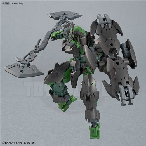 A rifle is included to enable bold action poses, even in full armor. The tip of the axe is movable; combine it to create a large axe. The axe and rifle can be mounted on the backpack. The Roy-Roy support mecha is also fully armored; additional joints allow for increased customization. Some armor parts from the 30MM 1/144 Commander Optional Armor [for Portanova/Red] are included in a new coloring.