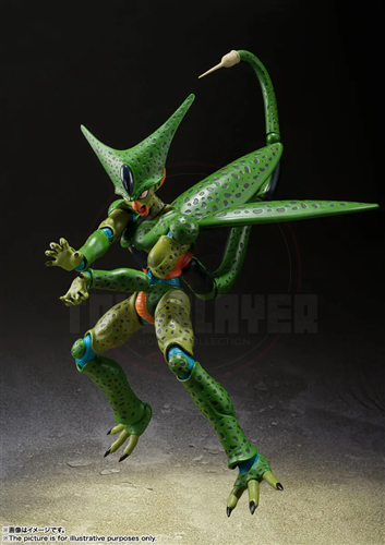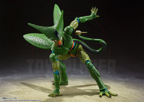 Cell returns to the S.H.Figuarts line with this First Form version. Cell stands over 6 inches tall and features interchangeable hands and faces, as well as assorted tail parts.