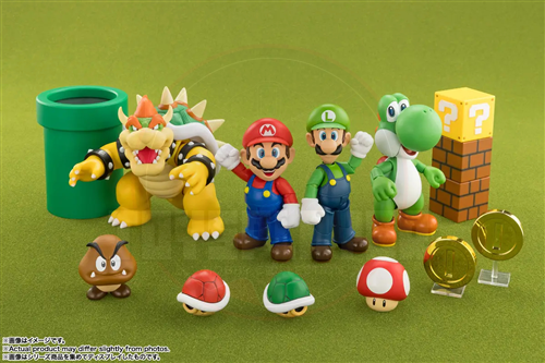 The figure's proportions have been recreated in a variety of action poses, and the Super Mushrooms, Hatena Blocks, and coins are all included in each figure. A Super Mushroom, Question Mark block, and coin are each included, as well as a special stand!