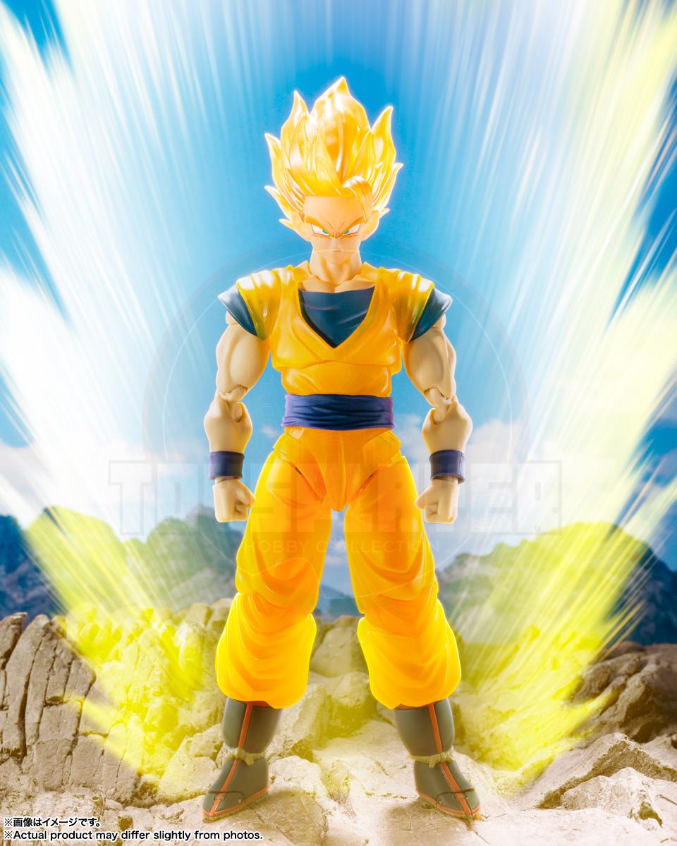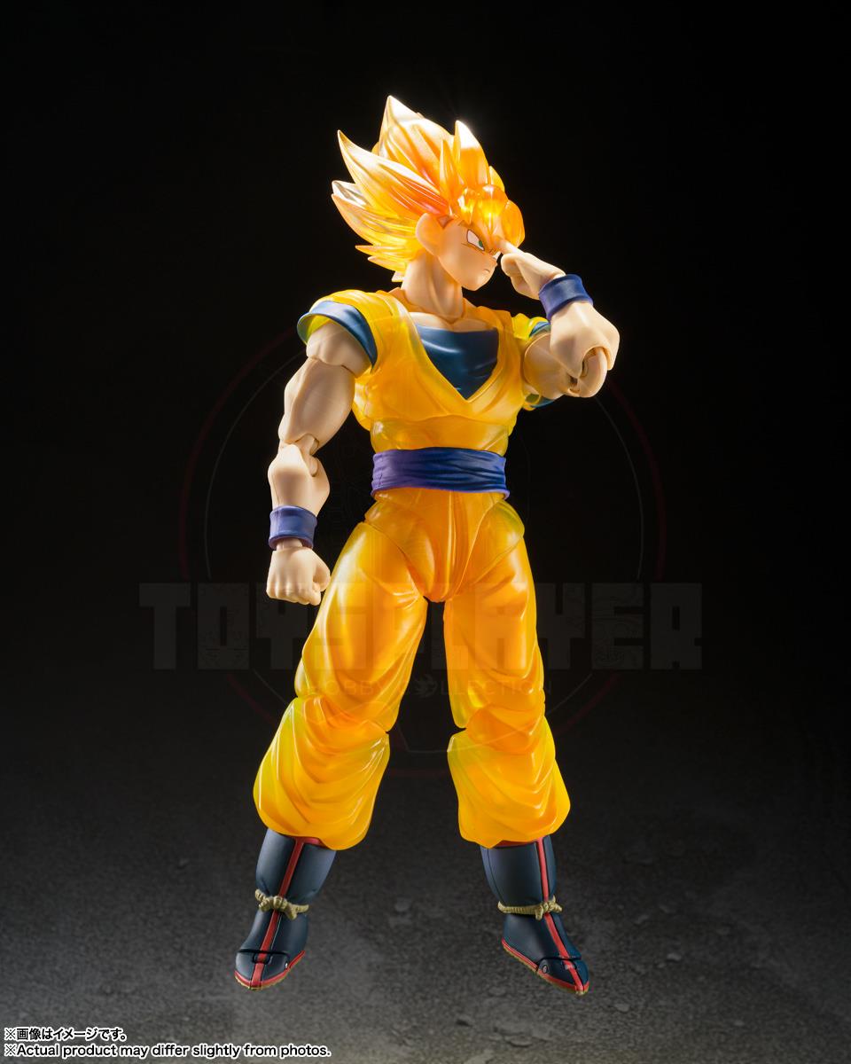 SUPER SAIYAN GOKU -Z FIGHTER- from "Dragon Ball Z" joins S.H.Figuarts! Includes two heads and three facial expressions newly modeled to depict Goku as he appears in the opening sequence and parts of the series. The hair and uniform parts are painted over a translucent material, made to resemble the scene from the opening sequence of "Dragon Ball Z" where the Z fighters assemble and Goku transforms into a Super Saiyan!
